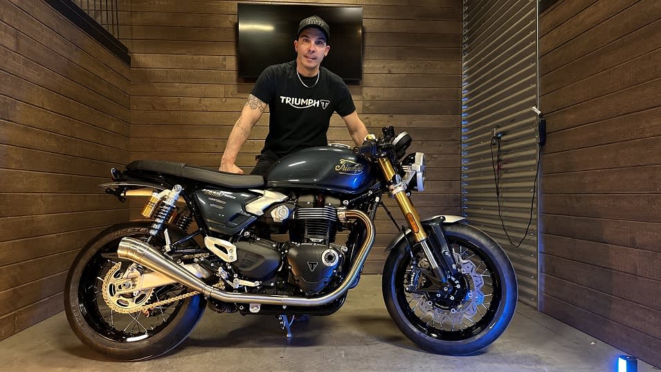 This custom Speed Twin 1200 RS seamlessly blends modern performance with classic styling. It’s finished in a deep graphite and gold custom paint scheme, accented by hand-laid pinstriping, and features the vintage Triumph heritage logo on the tank — a thoughtful nod to the brand’s iconic history.