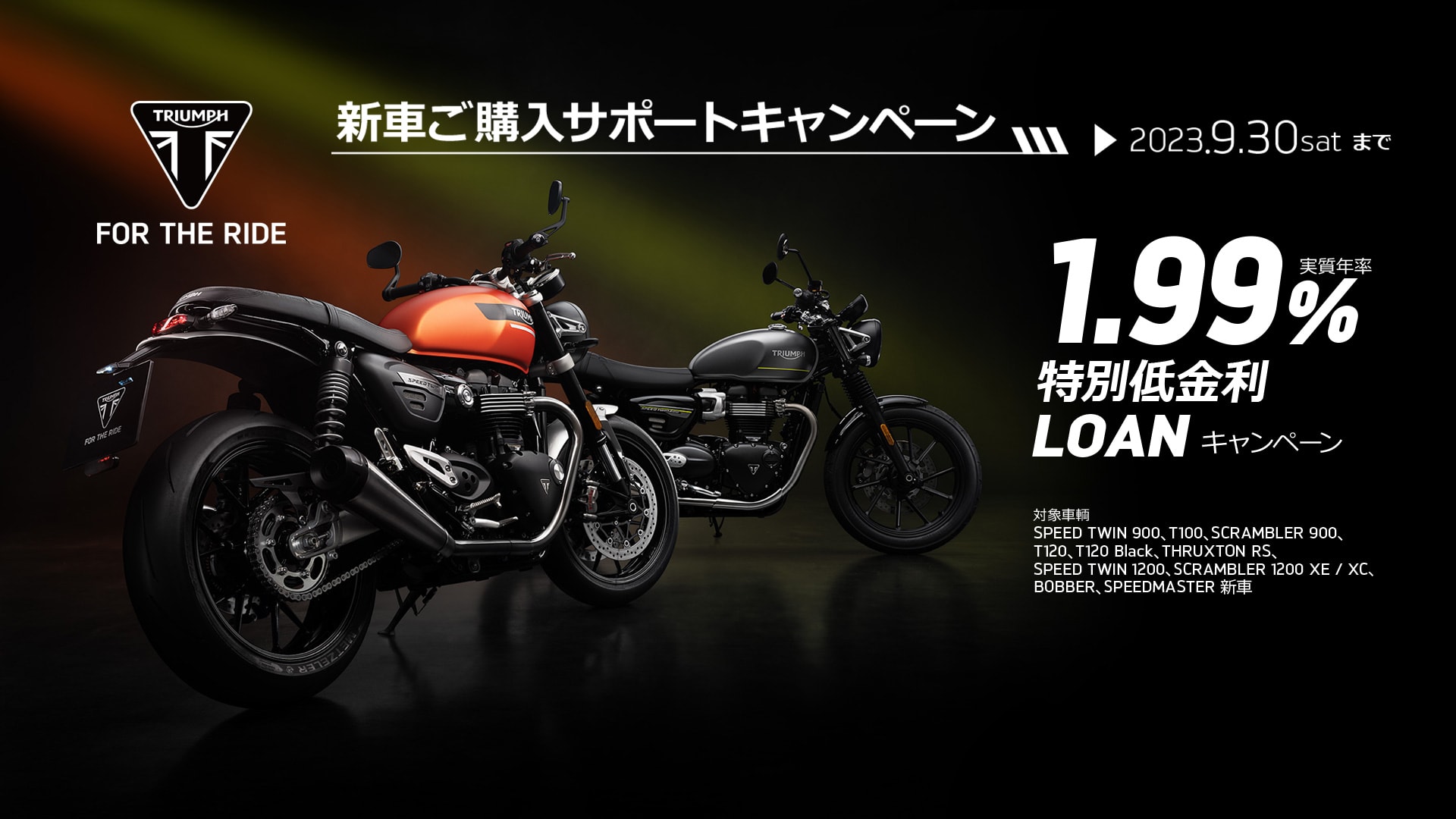 内容:キャンペーン期間中、全国のトライアンフ正規販売店にて対象車両をご成約、且つローン契約完了していただいたお客様に、「1.99% 特別低金利ローン」をご提供いたします。